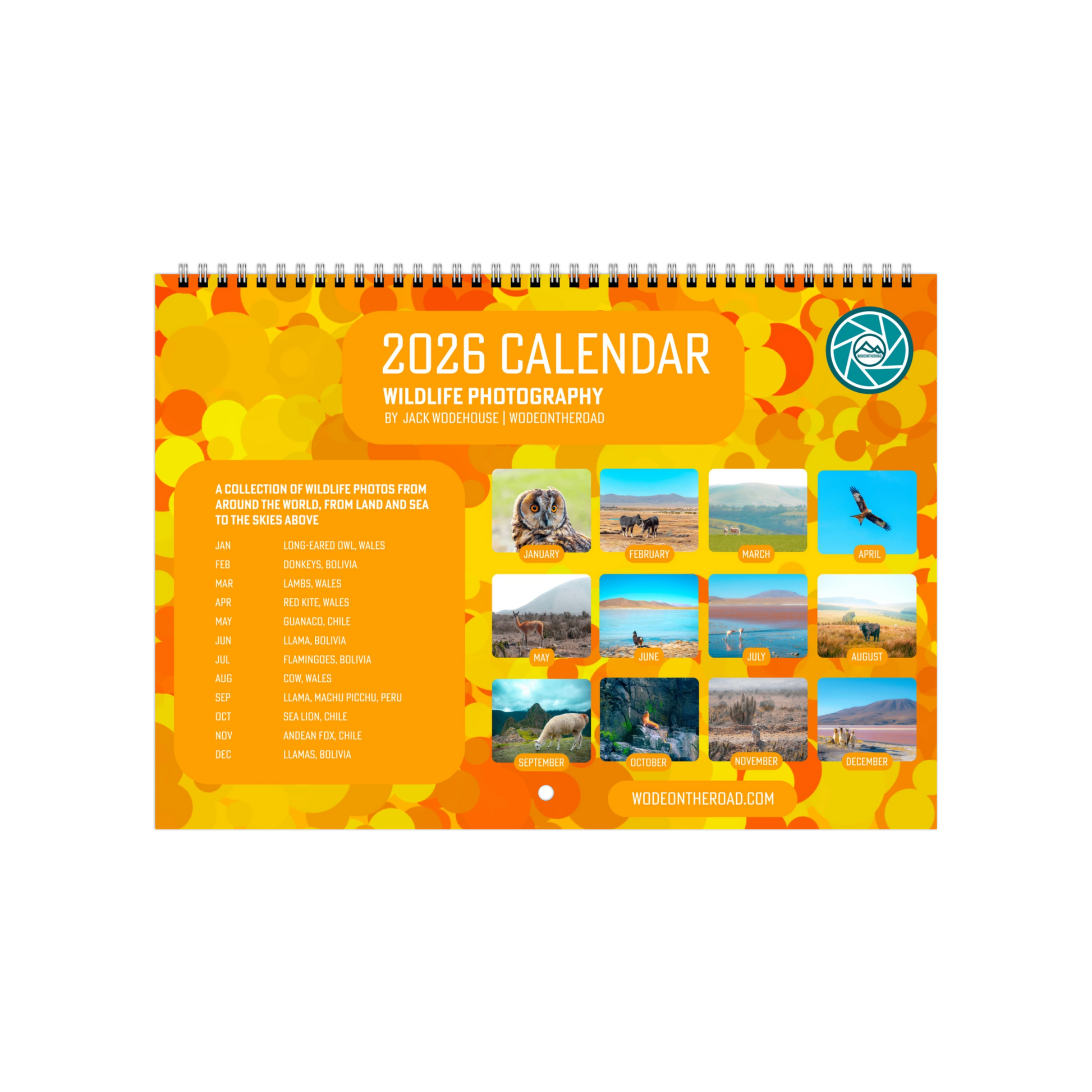 Wildlife photography wall calendar designed by me, Jack Wodehouse, featuring 12 varied wildlife photos taken on my travels and adventures both near to home and far away.